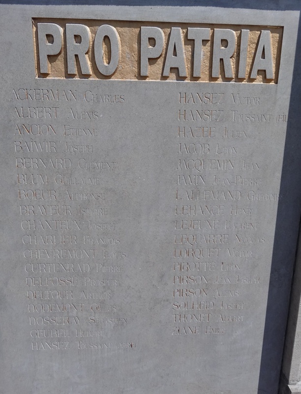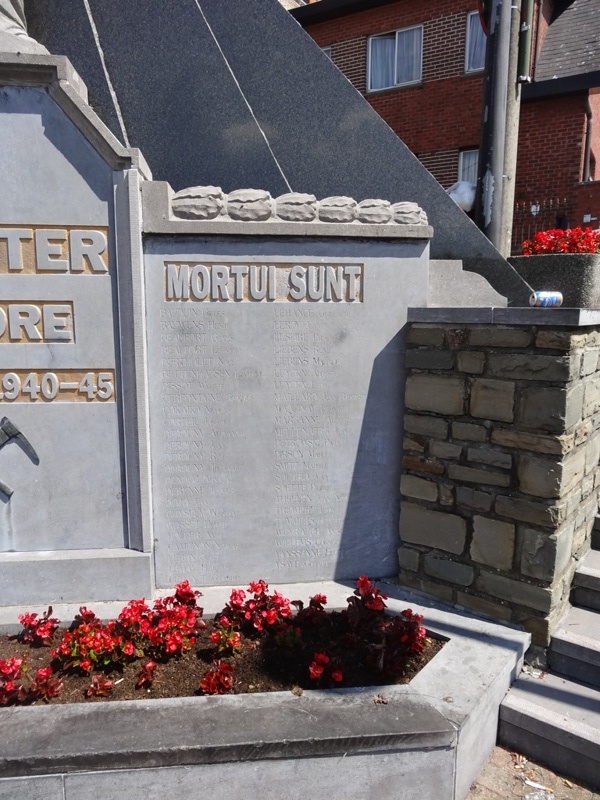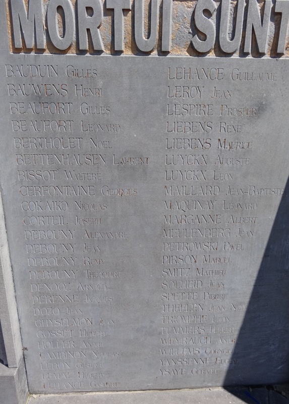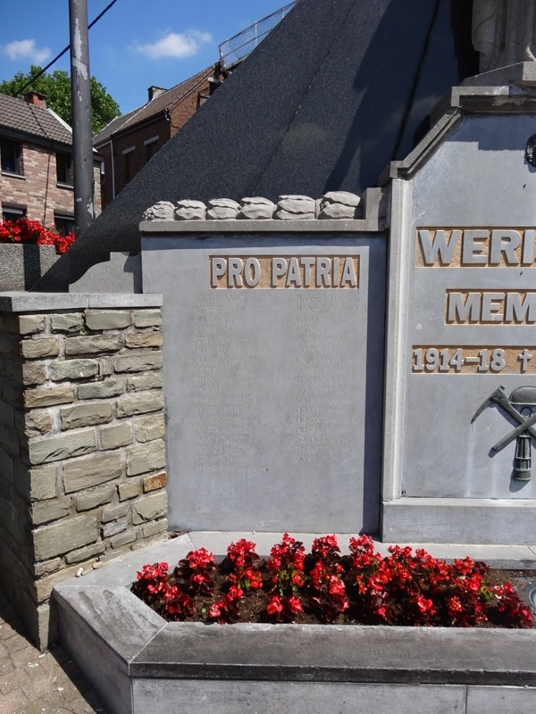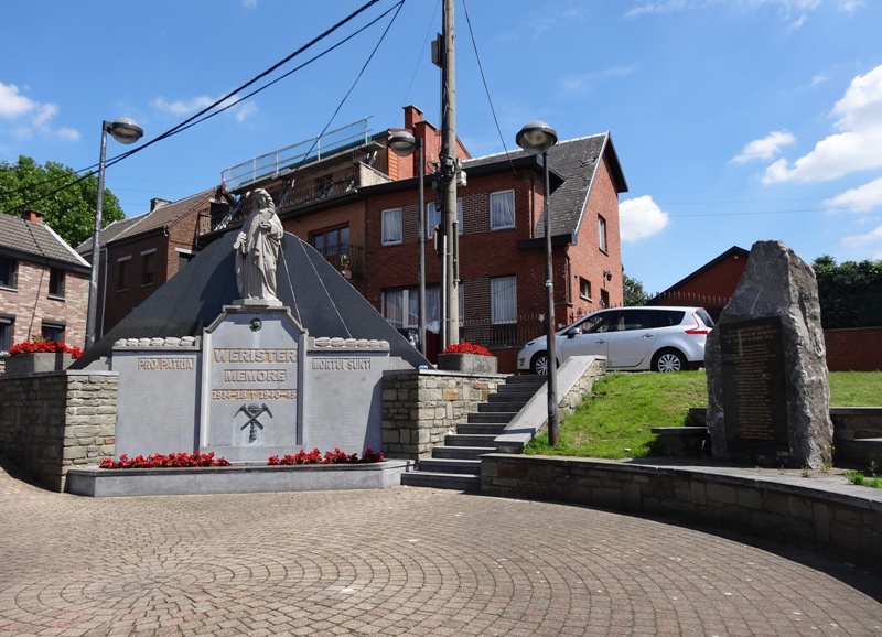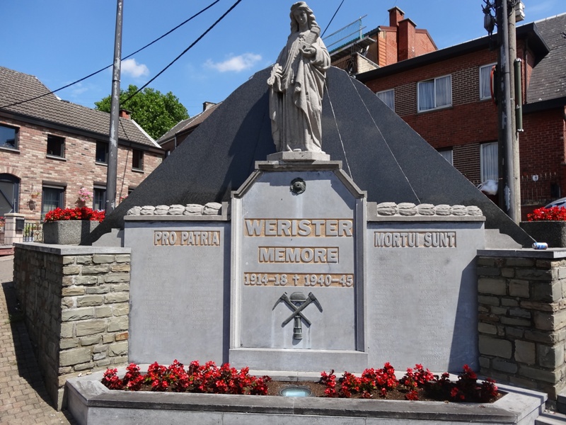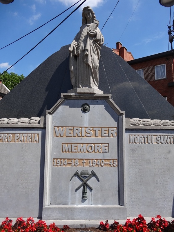 Localisation de ce monument: Place Hector Denis. Coordonnées GPS: +50°36'40.61", +5°39'56.34" Inscriptions figurant sur le monument "WERISTER MEMORE 1914-18 1940-45 PRO PATRIA [Trente-cinq noms, classés par ordre alphabétique] MORTUI SUNT [Quarante-sept noms, classés par ordre alphabétique]" Inscriptions figurant sur la plaque fixée sur un rocher à proximité du monument "RECONNAISSANCE DE LA COMMUNE DE FLÉRON À WINSTON CHURCHILL (1874-1965) AU GÉNÉRAL DE GAULLE (1890-1970) AU COLONEL JEAN PIRON (1913-1974) AU PRÉSIDENT ROOSEVELT (1882-1945) ROMSÉE LE 6 SEPTEMBRE 2003: 59ÈME ANNIVERSAIRE DE LA LIBÉRATION DE LA COMMUNE" Informations complémentaires: Matériaux: petit granit, marbre noir. Hauteur : 3,50 m. Le monument n'est pas signé et a été inauguré en 1994. Une statue est placée devant une grande plaque de marbre noir poli, évoquant un terril. Elle représente sainte Barbe, patronne des mineurs, qui tient ses attributs habituels, une palme et une tour. La statue et le monument proviennent de l’ancien charbonnage de Wérister, qui a fermé en 1967 (Source [276]) Pour en savoir plus sur le charbonnage de Wérister: La Société anonyme des Charbonnages de Wérister Voir les noms mentionnés sur ce monument |