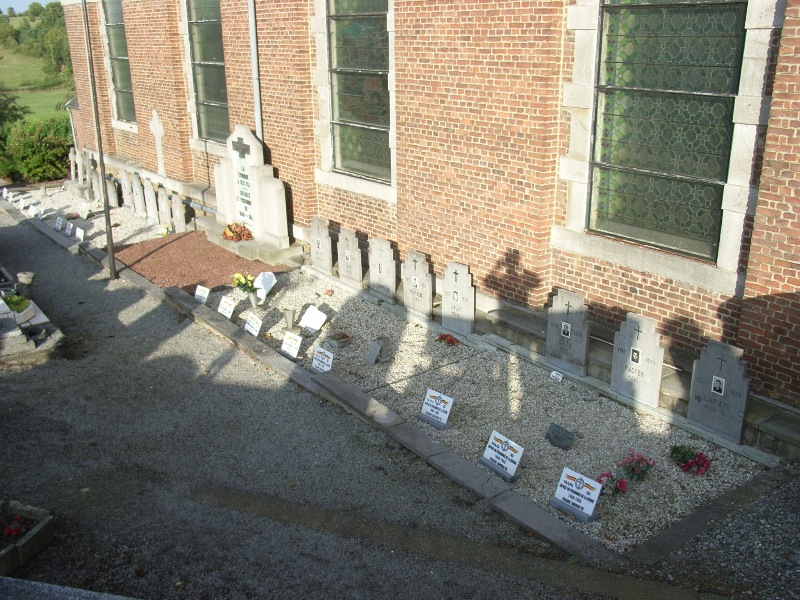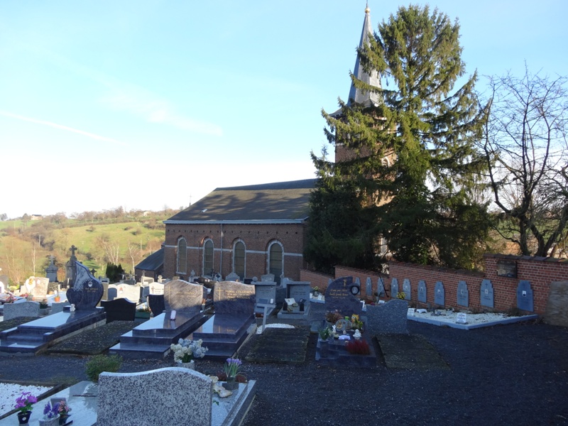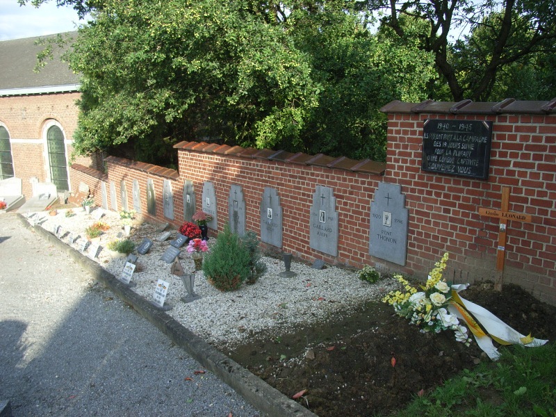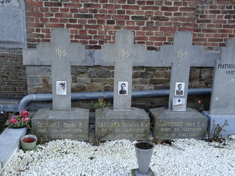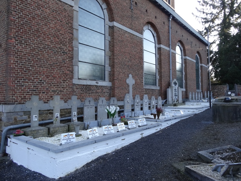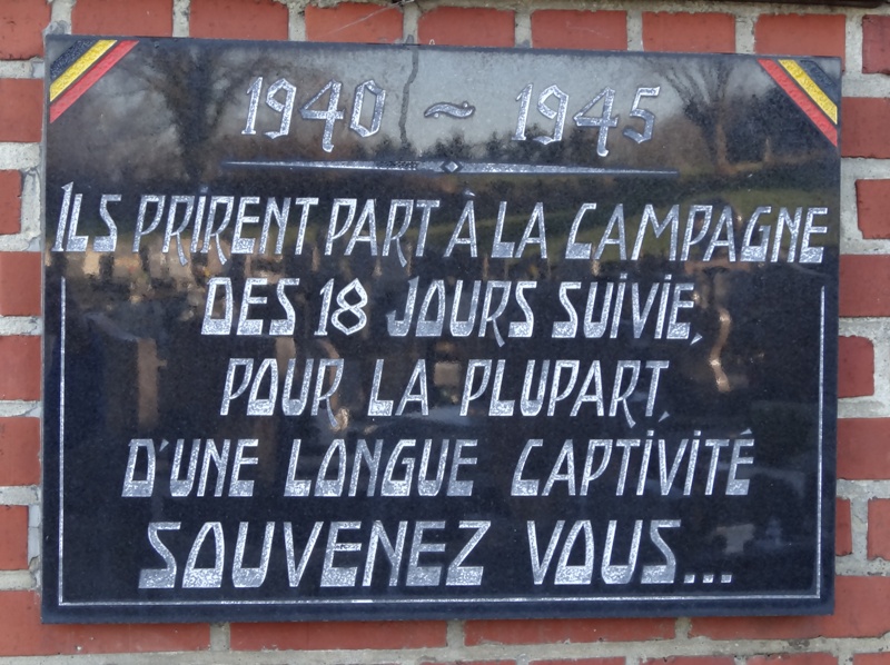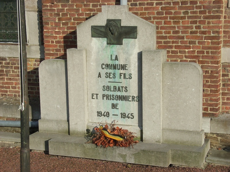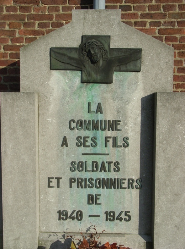 Localisation de cette pelouse: Voie Marion, dans le cimetière communal à côté de l'église Saint-Rémy. Coordonnées GPS: +50°41'46.16", +5°42'01.16" Inscriptions figurant sur le monument Sur le monument "LA COMMUNE À SES FILS SOLDATS ET PRISONNIERS DE 1940 -1945" Sur la plaque fixée sur le mur "1940 -1945 ILS PRIRENT PART À LA CAMPAGNE DES 18 JOURS SUIVIE, POUR LA PLUPART, D'UNE LONGUE CAPTIVITÉ SOUVENEZ VOUS..." Voir les noms des personnes reprises dans cette pelouse et décédées en 1940-1945 |