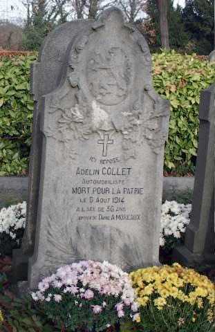 Plus d'infos/Meer info: Automobiliste. Première inhumation: Rhees, LG, BE. Réinhumé à Laeken - Laken, BR, BE, carré militaire du cimetière communal, tombe n° 64. Résidait à Laeken - Laken, BR, BE. Époux de A. MOREAUX (Source [38]). Photo: Tombe de Adelin COLLET au cimetière de Laeken - Laken, BR, BE (Source [38])