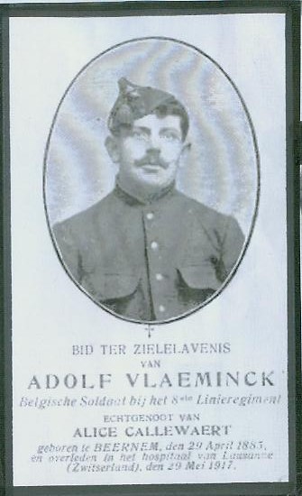 Plus d'infos/Meer info: Echtgenote: Alice CALLEWAERT (Bron [38]). Décédé à la clinique des Dailles, Epalinges, CH à 11 heures et demie du soir, à l'âge de 32 ans. Après une première inhumation au cimetière de La Sallaz, Lausanne, CH, piquet 148, le 31 mai 1917 (Source [4]), a été transféré dans le cimetière de Montoie (Lausanne) le 26 juin 1918. Il en a été exhumé le 28 avril 1927 pour être transféré dans le caveau du monument aux morts du Bois de Vaux à Lausanne, CH (Source: Registres des inhumations de Lausanne pour les années 1914-1919; informations aimablement communiquées par M. Guy TERRASSE, de Pully, CH). Sur le monument aux morts au cimetière du Bois-de-Vaux à Lausanne, le nom de famille est orthographié VLAMINCK. Overlijdensdatum: 28 mei 1917 volgens bron [4], 29 mei 1917 volgens oorlogsmonument te Beernem, WV, BE. Foto: Bron [38]