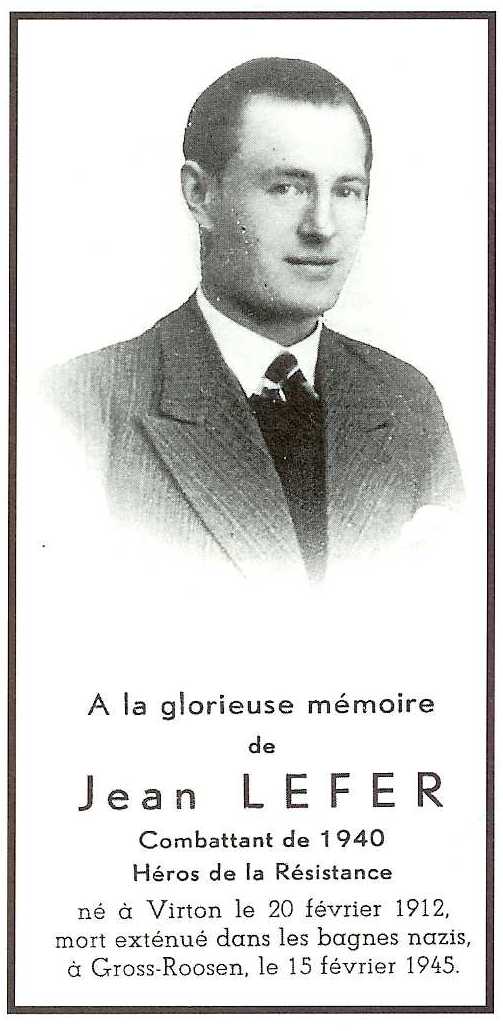 Plus d'infos/Meer info: Combattant de 1940. Héros de la Résistance. Mort exténué dans les bagnes nazis à Gross-Rosen (Souvenir mortuaire). En février 1944, Jean LEFER fut jugé à Arlon et condamné à 2 ans de prison. Il connut plusieurs camps; devant l'avance russe, il fut évacué d'un camp des environs d'Opeln et mourut d'épuisement et de misère quelques centaines de mètres avant d'arriver au camp de Gross-Rosen le 15 février 1945. Il y fut incinéré. C'était un brave qui avait déjà opéré quelques sabotages importants et avait rendu service à de nombreux réfractaires. Chasseur ardennais, il avait fait la campagne depuis Bastogne jusqu'à la Lys (Source [60]). Photo: Source [60]