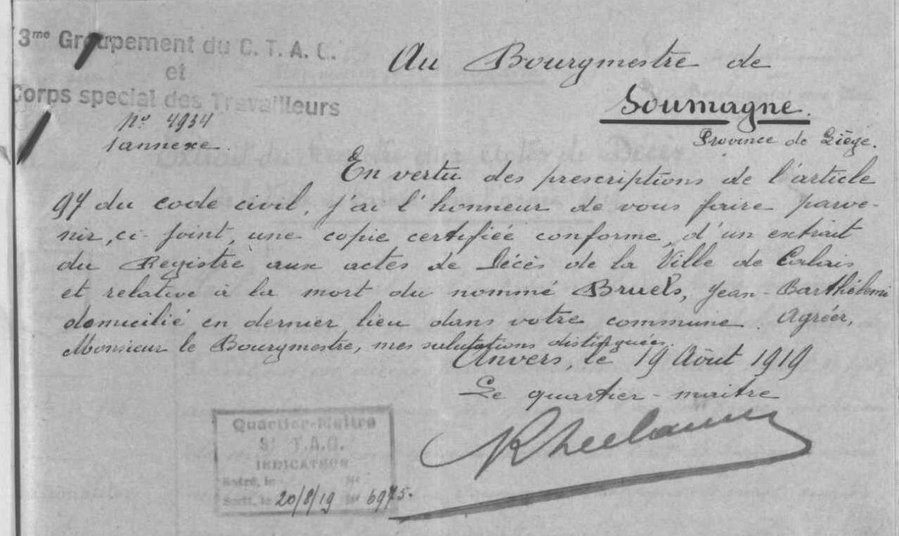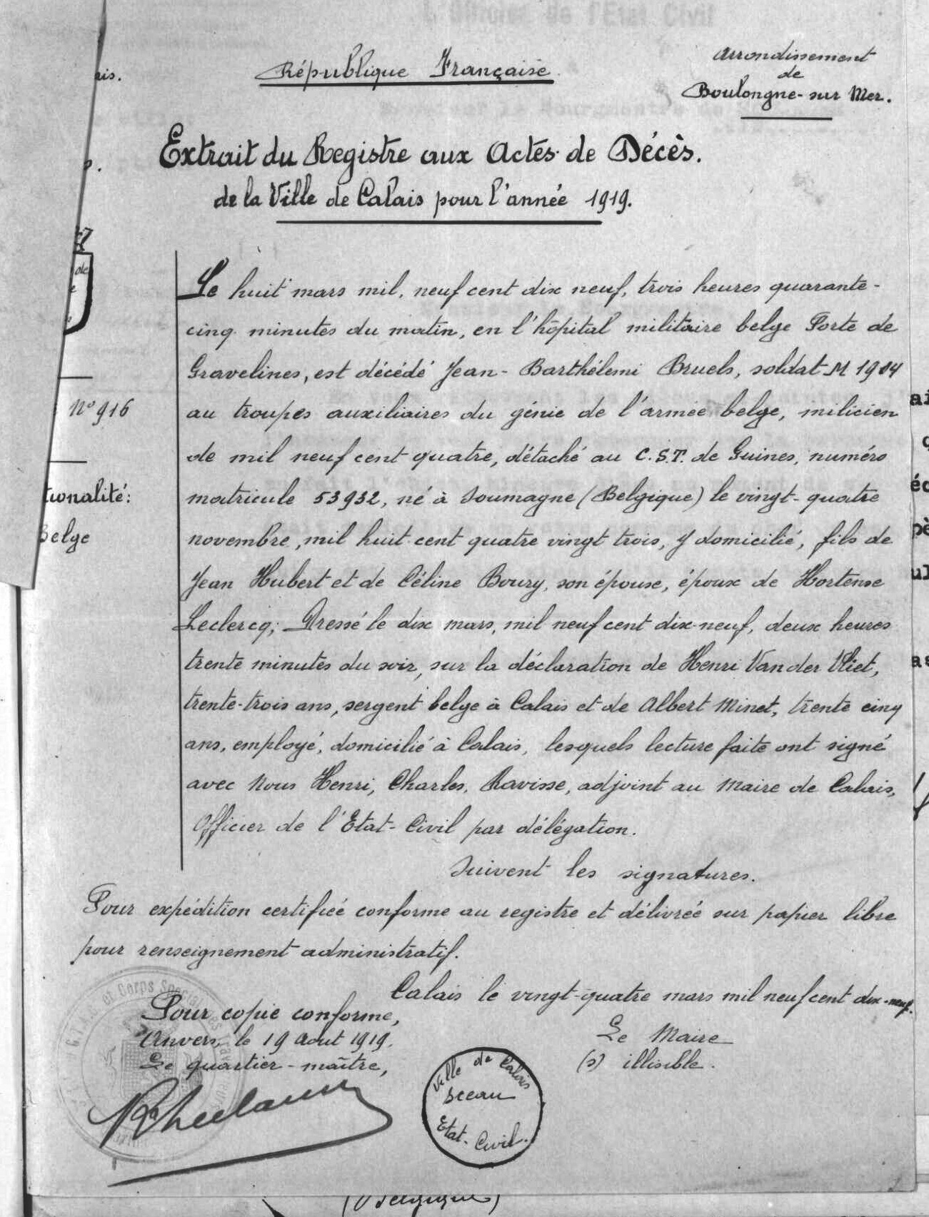 Extrait du registre aux actes de décès de Calais, Pas-de-Calais, FR