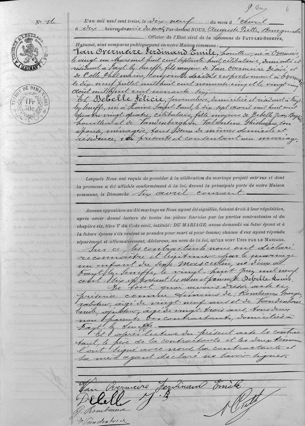 Acte de mariage de Félicie DEBELLE et Ferdinand VAN OVERMEIRE