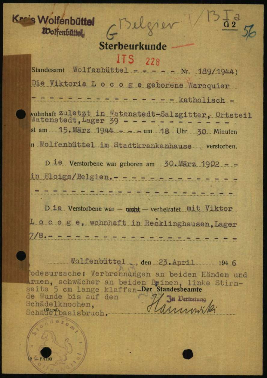 Acte de décès à Wolfenbüttel, Basse-Saxe, DE