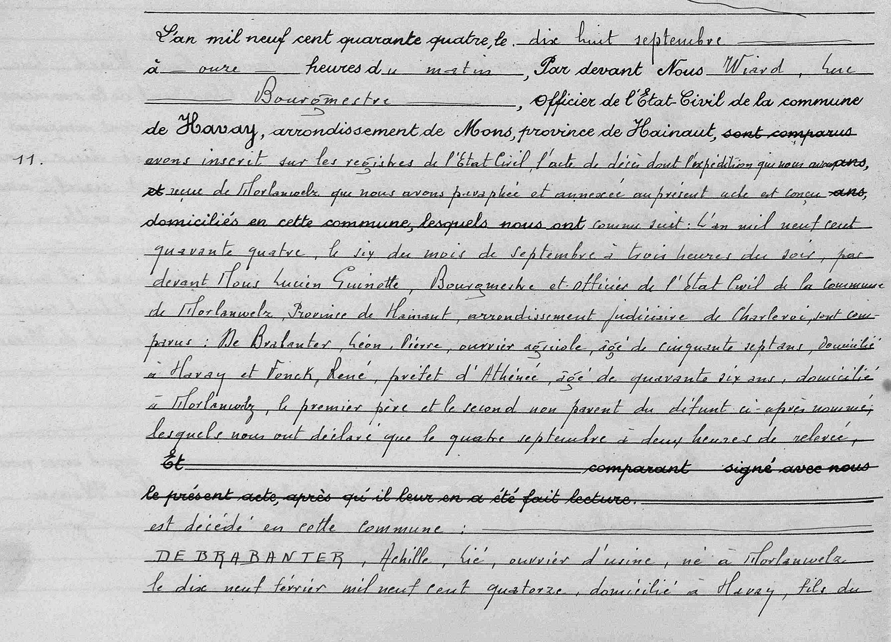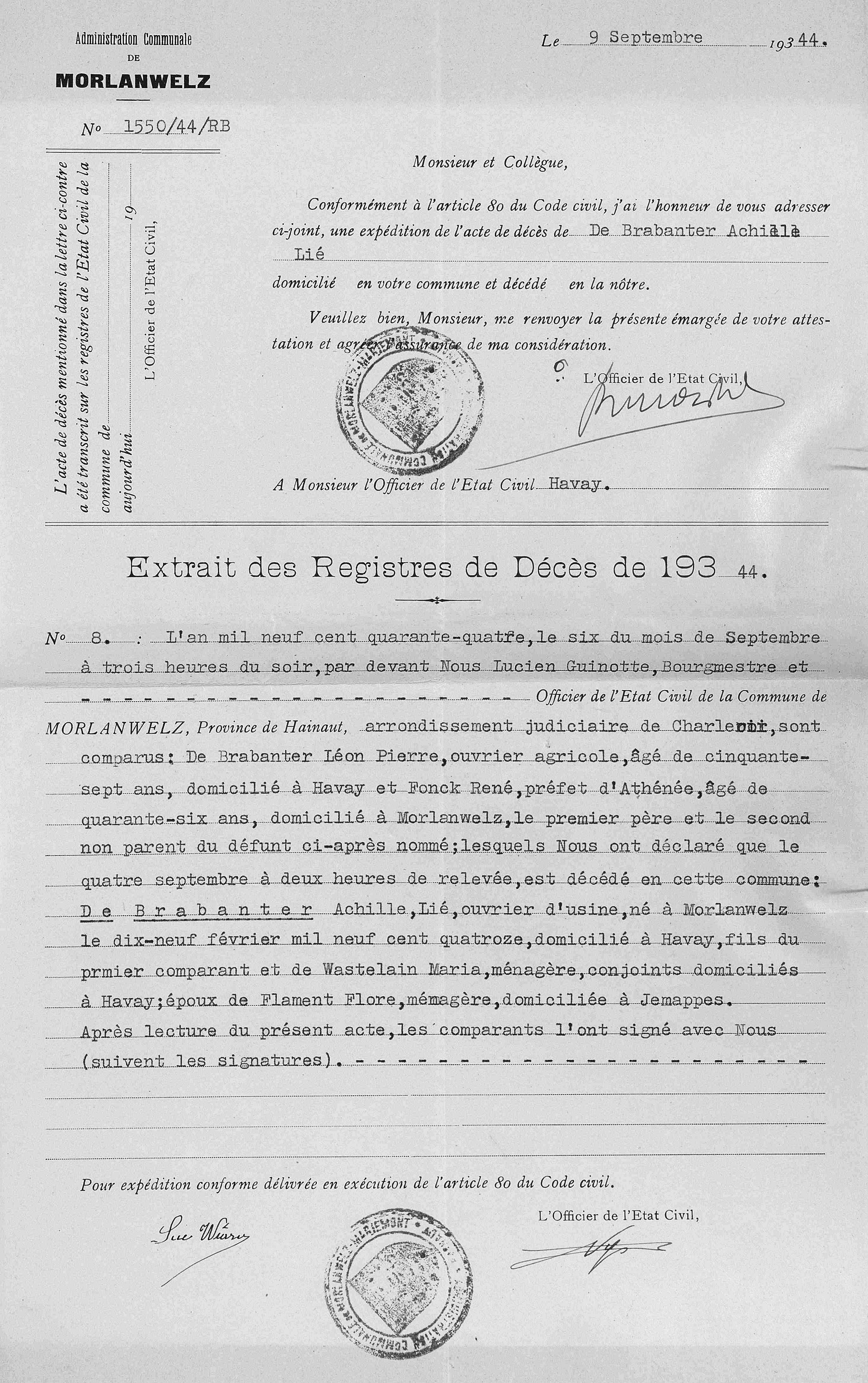 Copie de l'acte de décès à Morlanwelz, HT, BE envoyée à