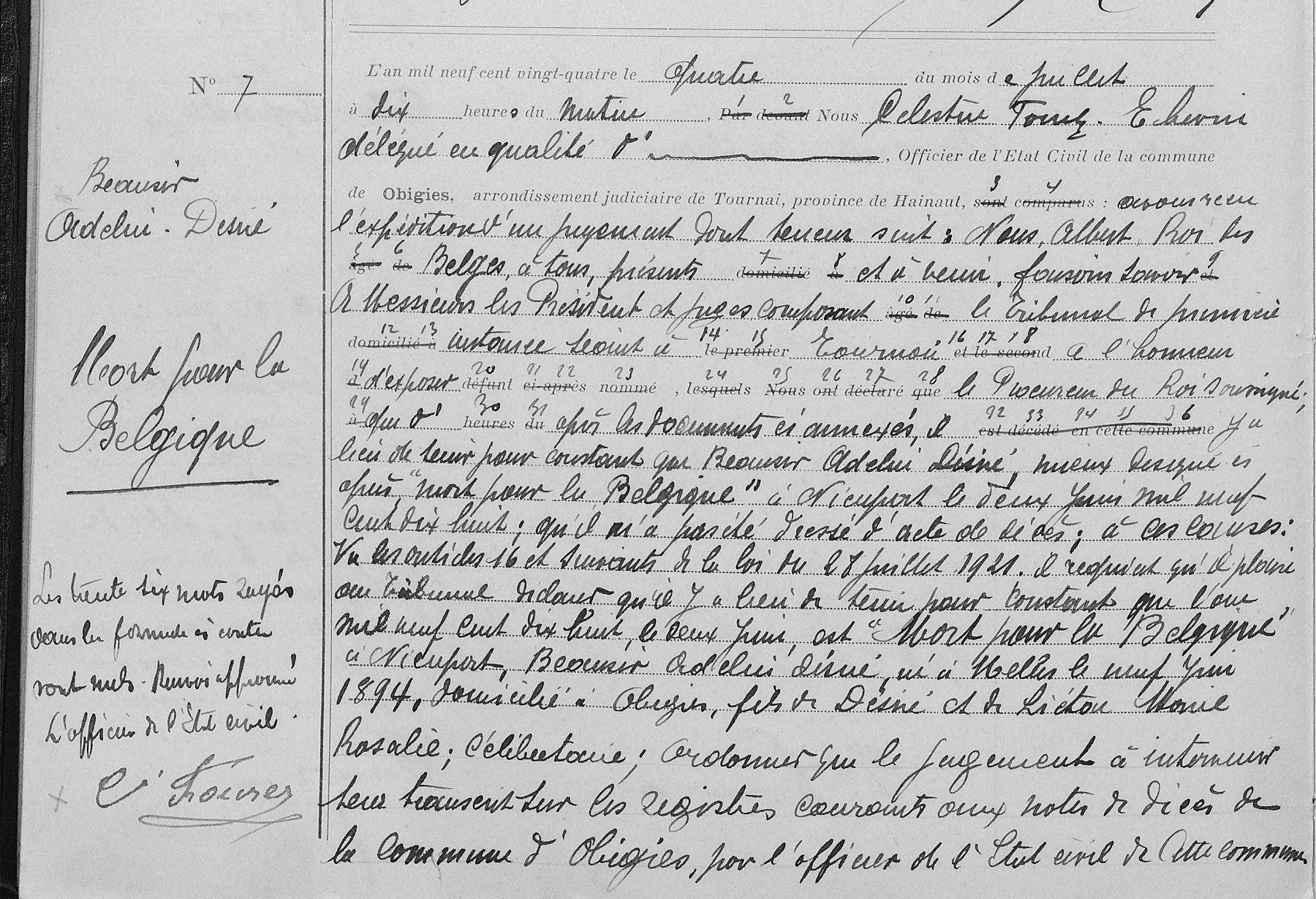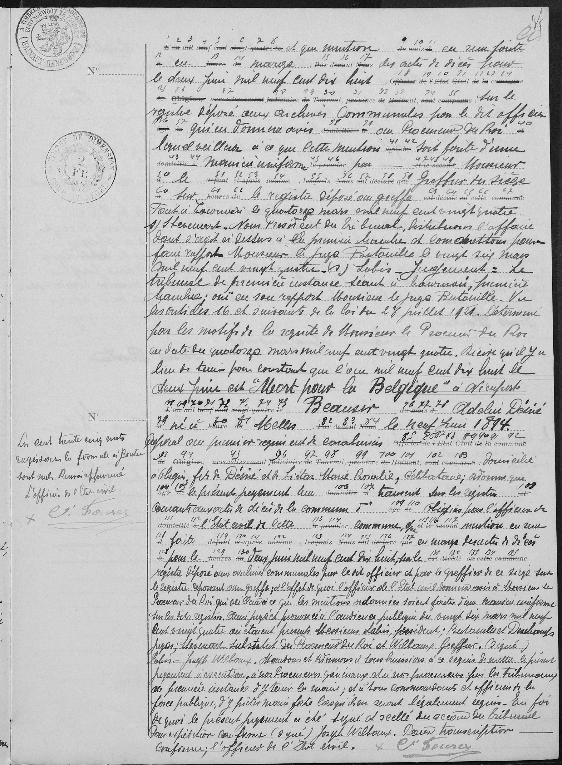 registres de l'état civil de Obigies, HT, BE