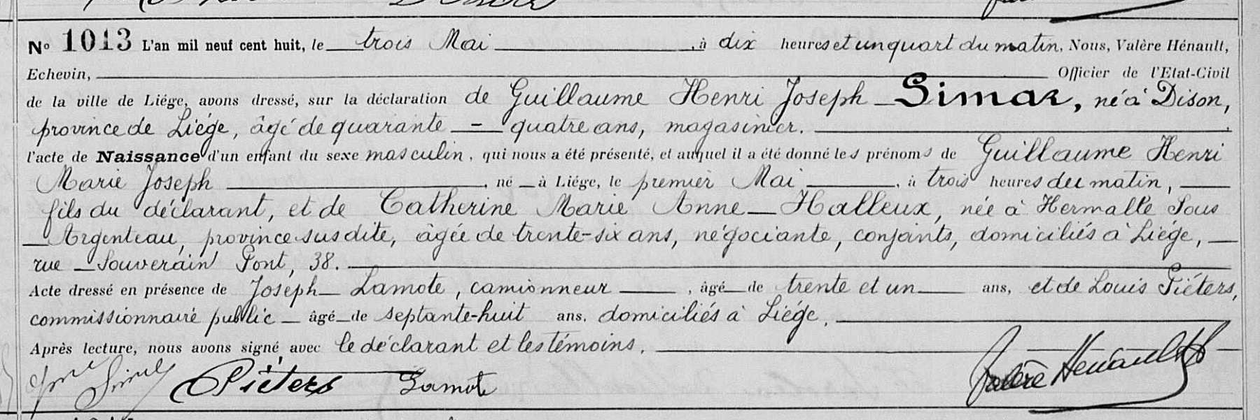 Acte de naissance à Liège (Luik), LG, BE (Source [358])