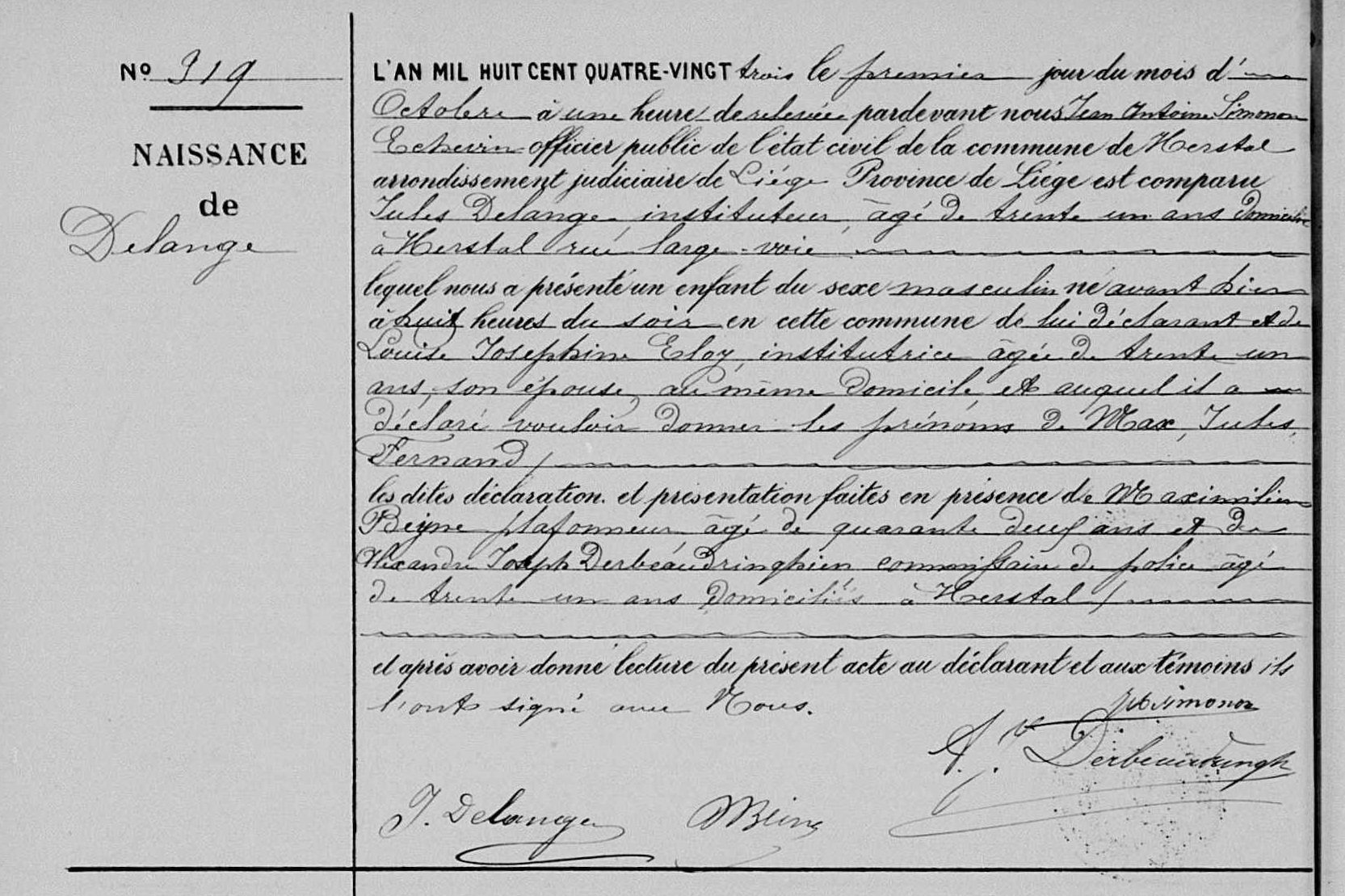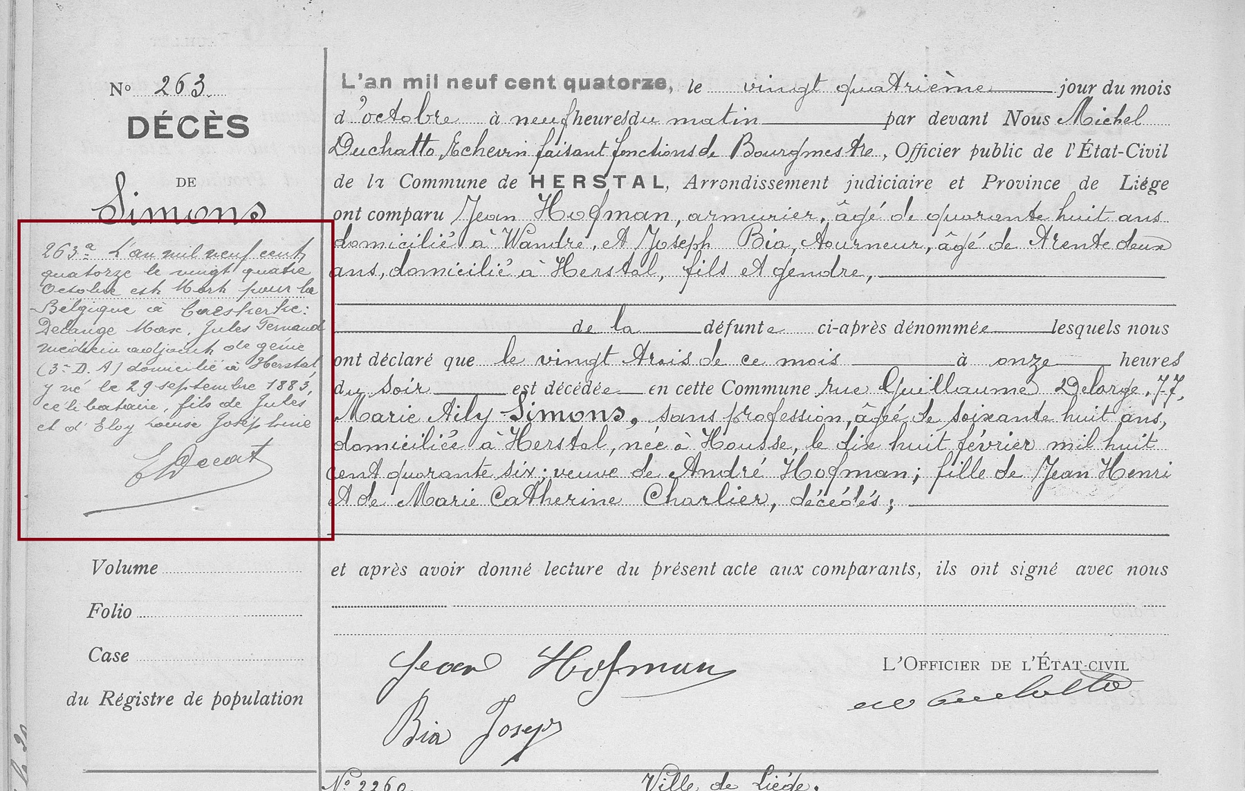 Inscription du décès dans les registres de l'état civil de Herstal,