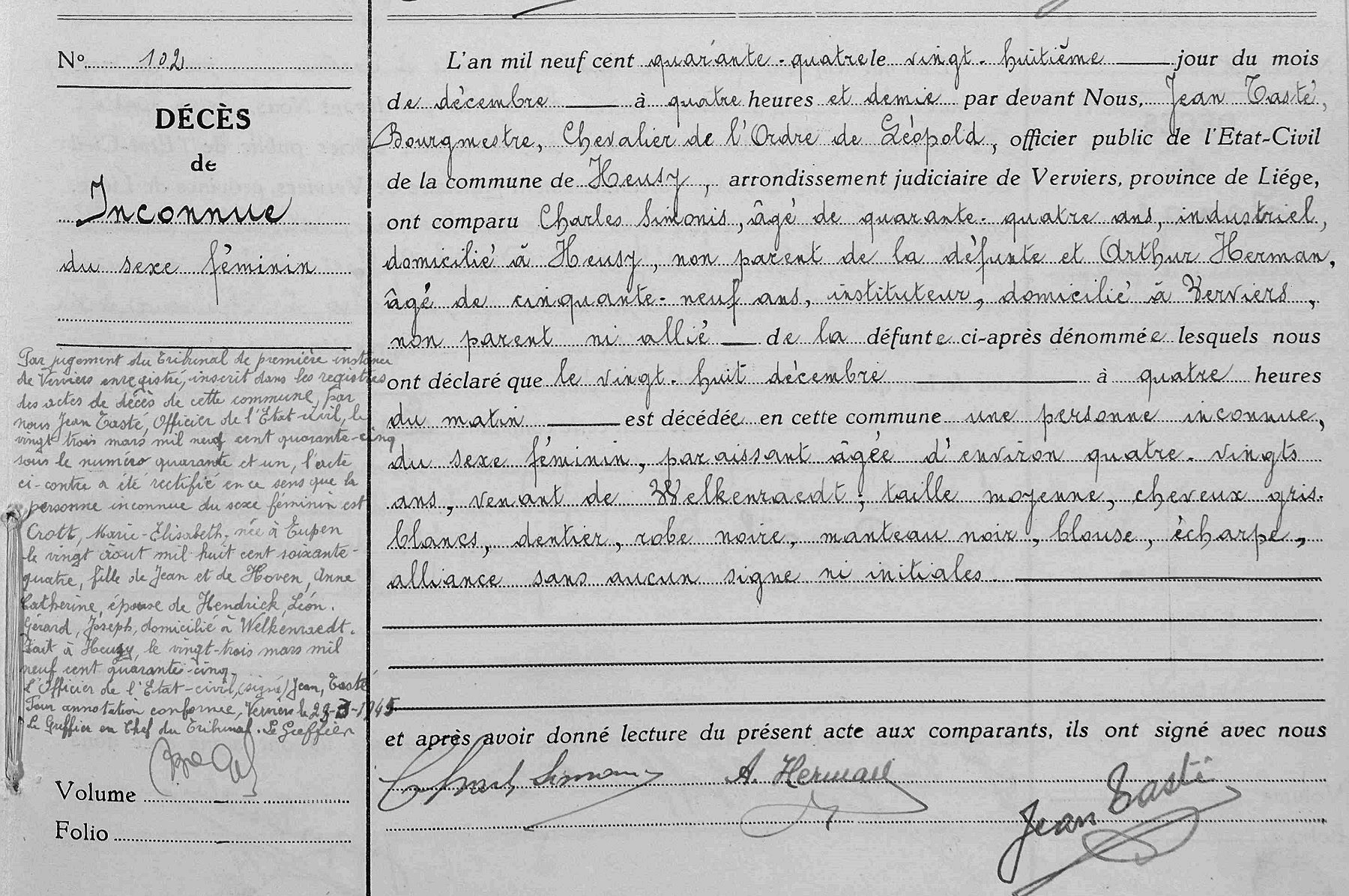 Premier enregistrement du décès en tant que personne inconnue du