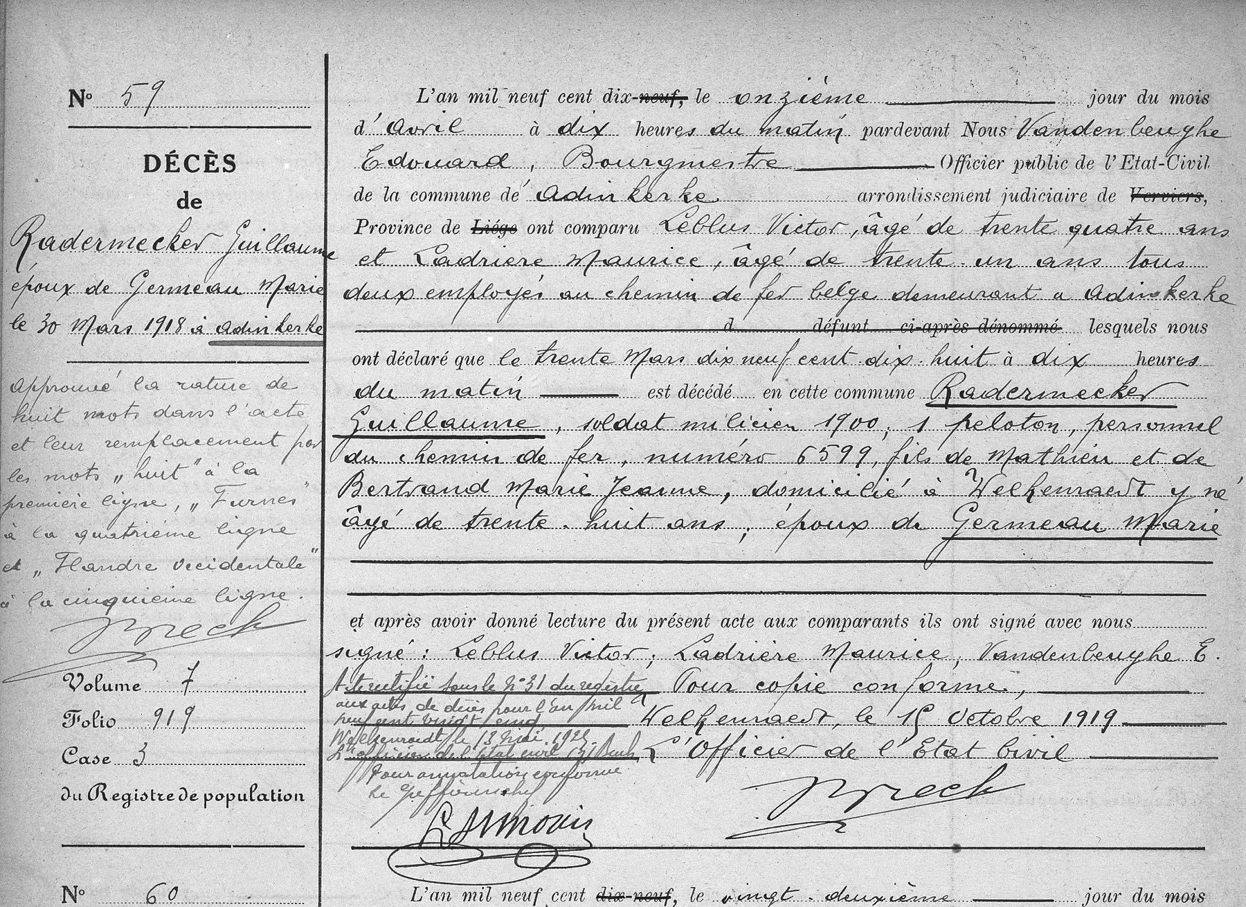 Première transcription de l'acte de décès dans les registres de
